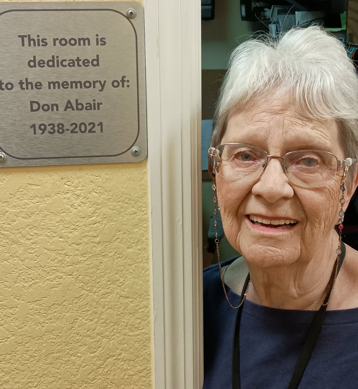 Nancy Abair with the room dedication sign